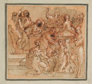 Penna e inchiostro, matita rossa, lumeggiature a biacca; carta bianca. Foglio: mm 130x140 ca. Supporto: mm 200x208. Sul verso è il timbro della Collezione Robert Mond (Lugt 2813a, cfr. Rudolf Wittkower, a publié le Catalogue of the collection of drawings by the old masters formed by Sir Robert Mond). Già attribuito a Ippolito Scarsella, detto lo Scarsellino, il disegno si colloca piuttosto in area toscana e più particolarmente senese dei primi del XVII secolo (cfr. Oxford, Christ Church, Anonimo Senese ca. 1600, Cristo Risorto, inv. 352, in J. Byam Shaw, Drawings by Old Masters at Christ Church Oxford, Oxford Clarendon Press, 1976). Il foglio originale, non in buone condizioni nonostante la parte disegnata sia ben leggibile, è interamente incollato su un supporto cartaceo, a sua volta controfondato. Quattro strisce di carta larga 35 mm e quattro più strette di carta colorata nera, sono state poi incollate (sec. XX, prima metà) sopra i quattro margini e infine fissati per due punti dal verso a un passe-partout.