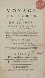 VOLNEY (Constantin-François de Chassebœuf), comte de). Voyage en Syrie et en Égypte, pendant les années 1783, 1784, & 1785. Paris : Volland, Desenne, 1787. — 2 volumes in-8, 192 x 120 : 14 pp. , (1 f. ), 383 pp. , 2 cartes ; 6 pp. , (1...