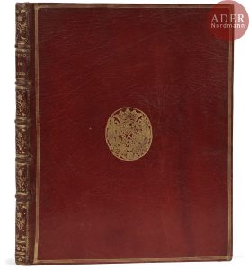 Maroquin rouge, triple filet doré en encadrement et armes dorées au centre sur les plats, dos à nerfs orné, roulette dorée intérieure, tranches dorées sur marbrures, étui (reliure de l’époque, étui moderne).