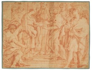Matita rossa e matita nera (per la quadrettatura); carta bianca. Foglio: mm 372x476. Supporto: mm 384x476. Composizione di grandi dimensioni forse preparatoria a un dipinto. La quadrettatura potrebbe essere stata eseguita dall’Autore stesso per i trasporto della composizione al supporto definitivo. Non se ne conosce la destinazione. Il disegno è interamente incollato a un cartoncino azzurro (sec. XIX). A parte lievi macchie e uno strappo in basso nella parte destra, il foglio è abbastanza ben conservato.