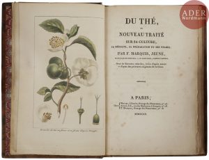 Marquis (François). Du thé, ou nouveau traité sur sa culture, sa récolte, sa préparation et ses usages. Paris : Nepveu, Audot, F. Marquis, 1820. — In-18, 143 x 93 : frontispice, 124 pp. , 9 planches, couverture illustrée.