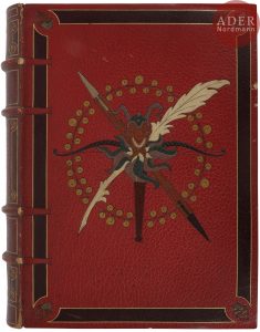 Maroquin rouge, larges bandes de maroquin noir en encadrement sur les plats, coupées aux angles d’une tête de diable mosaïquée de maroquin vert et marron ; composition mosaïquée au centre du premier plat, représentant une tête de fou en maroquin marron, vert et gris accompagnée d’une grande plume en maroquin beige, d’un arc en maroquin noir, de deux aiguilles en maroquin marron, gris et noir et d’un socle en maroquin brun, le tout dans un cadre rond à froid bordé de chaque côté de pastilles de maroquin ocre ; dos à nerfs orné dans les caissons de larges bandes de maroquin noir en encadrement, filet gras doré et feuilles dorées et mosaïquées en maroquin ocre à l’intérieur, doublures et gardes de soie moirée bordeaux, doubles gardes, tranches dorées sur témoins, couvertures et dos conservés, étui (Ch. Meunier).