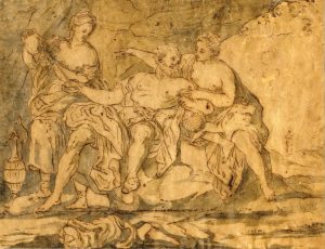 Penna, inchiostro e acquerello grigio; carta bambagina a vergelle, preparata, tinta e trattata. Foglio: mm 244x317. Tecnicamente il foglio è stato trattato, presumibilmente dallo stesso artista, come una carta trasparente che ne ha accentuato con il tempo il lieve ingiallimento. Si tratta di un disegno da lavoro, forse uno studio intermedio nella preparazione o trasporto di una composizione. Lievi ondulazioni della carta.