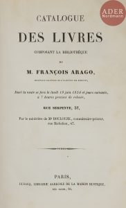 [ARAGO (François)]. Catalogue des livres composant la bibliothèque de M. François Arago, secrétaire de l’académie es sciences, Dont la vente se fera le lundi 19 juin 1854 et jours suivants. Paris : Dusacq, [1854]. — In-8, (2 ff. ), 188...