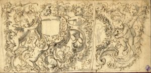 Penna e inchiostro su matita nera sottostante; carta bianca a vergelle. Foglio: mm 108x222. Opera decorativa ma molto fresca e di buona mano, ascrivibile all’area fiorentina dei pittori scenografici della cerchia del Chiavistelli. In basso sulla destra il timbro della Collezione torinese di Giuseppe Chiantorre (Lugt 540) da cui il foglio proviene. Incollato a un controfondo solo per i bordi e poi ulteriormente fissato al cartoncino sottostante rosso scuro, a sua volta incollato a un supporto cartonato marrone (sec. XX) dal verso, lungo il bordo superiore. Nel complesso è in ottimo stato di conservazione.