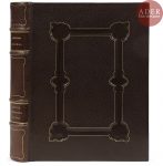 Maroquin brun, plats décorés d’un grand et large encadrement en creux, bordé de deux filets dorés, avec les angles et le centre des côtés droit et gauche multi lobés, dos à nerfs orné ; doublures composées d’une large pièce de chagrin vert, bordée d’un filet doré, encadrée d’une large bande de maroquin vert bordé d’une roulette dorée, et d’un encadrement de maroquin brun orné d’un filet aux pointillés dorés ; gardes de soie moirée verte, tranches dorées, couverture conservée, étui (J. Pourdieu le Coz).
