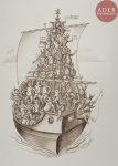 • Le premier propose les 113 compositions que l’artiste a réalisées pour l’illustration de La Nef des fous (Narrenschiff), gravées sur bois en camaïeu par Théo Schmied, auxquelles s’ajoutent un frontispice, une vignette de titre, un portrait et une figure à pleine page.
