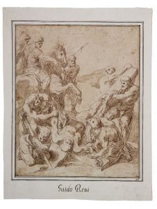 Penna e inchiostro, matita nera sottostante; carta bianca pesante a vergelle. Foglio: mm 304x248. Supporto: mm 386x296. Sono presenti due antiche numerazioni (sec. XVIII): all’interno del disegno, in basso a destra “104” e al di fuori entro le linee della cornice “107”. Il foglio proviene chiaramente da una collezione privata antica, non identificata da alcun timbro. In basso al centro a penna e matita nera: “Guido Reni”. In ottime condizioni. Il montaggio del foglio originale, che è interamente incollato ad una carta pesante e riquadrato da 4 linee a penna e inchiostro, è databile al XVIII secolo. Al verso, lungo il bordo in alto due strisce di carta, traccia di un precedente montaggio.