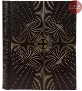 Maroquin bordeaux, plats ornés au centre d’une médaille dorée, ornée d’une croix en réserve, de laquelle jaillissent plusieurs filets dorés irradiants de différentes tailles, dessinant une grande croix ; dos lisse orné du titre et de filets dorés en V droit ou retourné, encadrement de maroquin bordeaux à l’intérieur, doublures de soie dorée ornée d’une composition originale à l’encre et lavis, gardes de soie noire chinée, doubles gardes, tranches dorées sur témoins, chemise à dos et bandes à rabats de maroquin bordeaux, étui (G. Cretté succ. de Marius Michel).