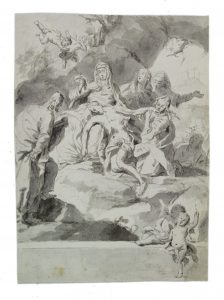 Penna e inchiostro acquerellato; carta pesante bianca a vergelle con filigrana (cifre GB). Foglio: mm 300x218. Composizione eseguita forse in preparazione di una parete affrescata o di una stampa. Il foglio è in ottimo stato di conservazione.