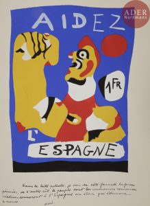 Il comprend de nombreuses reproductions en noir, mais également un beau pochoir hors texte en couleurs sur vélin de MIRÓ, intitulé Aidez l’Espagne.