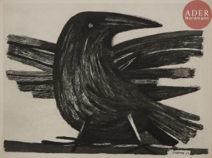 Celui-ci est l’un des 45 sur papier vélin d’Arches ; il a été enrichi dans une enveloppe noire jointe, du prospectus de parution, de 2 photos, l’une du dessin de corbeau par Manet, l’autre d’une composition de Prassinos, et d’une lettre signée de l’éditeur adressée à M. -A. Colson à qui Worms donne l’autorisation de reproduire quelques-unes des illustrations gravées sur bois par Mario Prassinos dans un court métrage sur les corbeaux qu’elle s’apprête à réaliser.