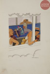Maroquin bordeaux, premier plat orné d’une geisha ; du box noir découpé et collé forme la silhouette du personnage, les vêtements sont en maroquin vert, le visage et l’une des jambes ont été dessinés à froid, un filet doré horizontal représente l’horizon ; second plat orné d’une composition dorée et à froid figurant le mont Fuji ; dos à 2 larges nerfs, encadrement de maroquin bordeaux en encadrement à l’intérieur, orné d’un filet doré droit coupé en haut et en bas par un filet ondulé aux pointillés, doubles gardes, tête dorée, non rogné, couverture et dos conservés, étui (reliure de l’époque). Second livre édité par la Société des Bibliophiles du papier, tiré à seulement 110 exemplaires sur vélin blanc des papeteries Johannot et illustré de 67 compositions humoristiques de Jacques TOUCHET (1887-1949), dont 58 dans le texte et 9 à pleine page, mises en couleurs par Saudé.