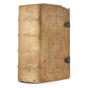 truie, large décor estampé à froid sur les plats, dos à nerfs, tranches bleues, fermoirs métalliques, [rel. de l’époque].