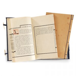 CLAUDEL (Paul). Connaissance de l’Est. Paris, Georges Crès & Cie, 1914 ; 2 vol. gr. in-8 (feuillets pliés à la japonaise), brochés à la japonaise, sous portefeuille à rabat en toile bleue, petits fermoirs de corne.
