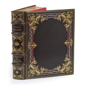 FRANCE (Anatole). La Rôtisserie de la Reine Pédauque. Paris, Édouard Pelletan, 1911 ; in-4, maroquin brun, large dentelle de style rococo sur les plats mosaïquée de listels rouges et bleus, dos à nerfs orné de carquois dorés et de roses...