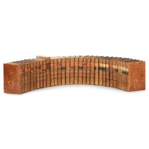 ƒ LA HARPE (Jean-François de). Abrégé de l’histoire générale des voyages. Paris, Hotel de Thou, Laporte, Moutardier, 1780, 1786, 1800-1802 ; 32 vol. in-8, basane marbrée, dos à nerfs orné de motifs dorés, pièces de titre et de...