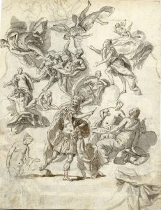 Penna e inchiostro, acquerellature in grigio, su tracce di matita nera; carta bianca pesante a vergelle. Foglio: mm 254x197. Grande freschezza grafica, ascrivibile ad artista di area ligure non lontano da Anton Jacopo Boni. In ottimo stato di conservazione.
