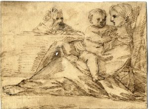 Penna e inchiostro; carta a vergelle pesante bianca. Foglio: mm 150x203. Sul verso del foglio un’iscrizione, posteriore all’esecuzione del disegno, con una data: “22 luglio 1769 [?]/ Stima di beni del Sig. Ab.te/Lazzarini”. Il disegno presenta una linea di cornice a penna, che forse non è coeva alla composizione. Due piccoli fori da ossidazione dell’inchiostro al centro e verso l’occhio della Vergine. Sul verso le tracce di precedenti incollaggi.