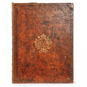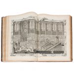 Titre-frontispice, 39 planches (dont 9 à double page) par Audran, Beauvais, Cochin père, Larmessin, Tardieu, Edelinck, etc. montrant les costumes de cérémonie du roi et des grands officiers de la couronne, exécutées pour la plupart d’après Pierre Dulin et Pierre-Josse Perrot.Le texte, composé par Antoine Danchet et publié sous la direction de l’abbé Jean-Paul Bignon et de Claude Gros de Boze, occupe 34 ff. gravés, ornés de riches bordures, cartouches et vignettes.L’édition fut imprimée aux dépens du roi, qui s’en était réservé tous les exemplaires pour les offrir à ceux qu’il souhaitait gratifier.Reliures aux armes de Louis XV, avec son monogramme couronné aux angles.Brunet, V, 19. Cohen, 917.