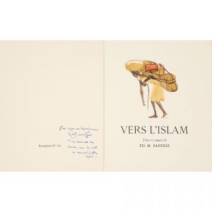 ƒ SANDOZ (Édouard Marcel). Vers l’Islam. Paris, Pierre Bricage, 1957 ; in-4 en ff., couverture imprimée rempliée, chemise demi-parchemin et étui.