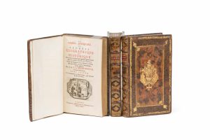 encadrement de veau jaspé avec roulettes, double filet et fleurons d’angles, armoiries centrales, dos à 5 nerfs ornés, tranches dorées avec petite ciselure (reliure hollandaise de l’époque).