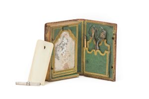 Sur le premier contreplat se trouve logé un nécessaire de toilette avec une paire de ciseau, une brosse, un cure-dents et, dans la boîte, des logements pour un écritoire très fin en ivoire avec un crayon porte-plume et une glace.