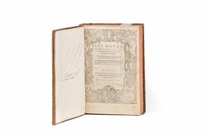 Bel encadrement de titre allégorique gravé sur bois avec putti, fruits, branches, feuilles, outils… et marque de l’éditeur au dernier feuillet.