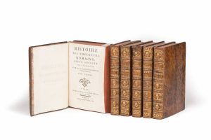 Jean-Baptiste-Louis CREVIER. Histoire des empereurs romains, depuis Auguste jusqu’à Constantin. Paris, Desaint et Saillant, 1750-1756. 6 volumes in-4, basane marbrée, dos à 5 nerfs ornés (reliure de l’époque).
