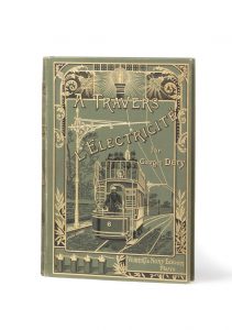 Georges DARY. A travers l’électricité. Qu’est-ce que l’électricité ?… Paris, Vuibert et Nony, s.d. In-4, percaline verte illustrée d’un motif noir et doré révolutionnaire, le Tramway, tranches dorées (reliure de l’éditeur...