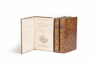 Henri Caterin DAVILA. Histoire des guerres civiles de France, Sous les règnes de François II, Charles IX, Henri III et Henri IV… Amsterdam, Arkstée & Merkus, 1754. 3 volumes in-4, veau marbré, dos à 5 nerfs ornés (reliure de l’époque).