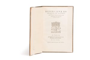 Joachim DU BELLAY. Divers Ieux rustiques, et autres œuvres poétiques de... Paris, Federic Morel, 1558. In-4, maroquin violet, encadrement à la Du Seuil avec lys, chiffre couronné aux angles et armoiries centrales, dos à 5 nerfs orné de lys...