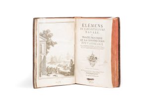 Henri-Louis DUHAMEL DU MONCEAU. Élémens de l’architecture navale, ou Traité pratique de la construction des vaisseaux. Paris, Jombert, 1752. In-4, veau marbré, dos à 5 nerfs orné (reliure de l’époque).