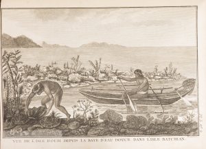 Elle est ornée d’une grande carte dépliante et de 28 planches géographiques, cartographiques et descriptives des mœurs des habitants de Nouvelle Guinée, gravées sur cuivre par Bernard, dont une étonnante Vue circulaire du Havre Ubal.