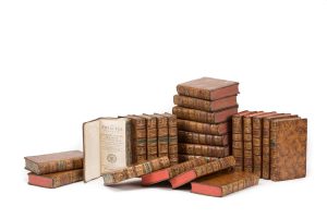 Exemplaire composite avec 3 décors différents de reliures, minimes usures d’usage, cachets d’une congrégation religieuse et ex-libris sur quelques titres, mouillures au tome XXX.