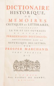 Prosper MARCHAND. Dictionnaire historique, ou Mémoires critiques et littéraires, concernant la vie et les ouvrages de divers personnages distingués, particulièrement dans la république des Lettres. La Haye, Pierre de Hondt, 1758-1759. 2 tomes...