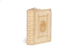 PLINE. Epistolarum libros decem… Amsterdam, Janssonio-Waesbergios, 1734. In-4, vélin crème, double encadrement avec fleurons aux angles type Du Seuil, grand fleuron armorié au centre, dos à 5 nerfs orné (reliure hollandaise de l’époque).