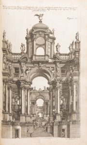 Édition bilingue de la première partie de Perspectiva…, donnant le texte en latin avec une traduction allemande en caractères gothiques, de ce célèbre ouvrage sur la perspective du peintre, décorateur, mathématicien et théoricien Andrea Pozzo.