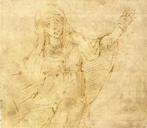 Penna e inchiostro (al recto); penna e inchiostro, lumeggiature a biacca, su carta preparata (al verso); carta bianca a vergelle filigranata (rombo con stella inscritto in cerchio). Foglio: mm 182x208. Il foglio è stato attribuito anche a Girolamo Pacchia (collezione privata) ma deve piuttosto essere ricondotto in ambito fiorentino, vicino, forse a Jacone (cui si attribuiscono alcuni disegni simili conservati a Oxford, Christ Chirch, cfr. J. Byam Shaw, Drawings by Old Masters at Christ Church, Oxford, at the Clarendon Press, 1976, nn. 102-106). La composizione al verso non è in buone condizioni, poiché la preparazione è in gran parte caduta rendendo difficile la lettura del soggetto. La composizione al recto invece è in ottimo stato e, a parte una leggera sporcizia diffusa non presenta alcun danno rilevante.