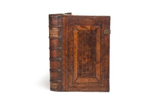 [RELIURE ALLEMANDE DU XVIe siècle]. In-folio, veau havane estampé à froid, multiples filets gras et maigres avec double encadrement droit et grand rectangle central, roulette répétée représentant les 4 évangélistes :