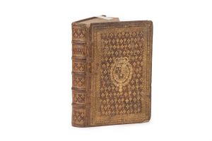[RELIURE du XVIIe siècle]. Petit in-4, basane fauve, encadrement droit formé de multiples filets et roulettes dorés, le champ orné d’un semé de L couronnés et de lys, armoiries centrales, dos à 5 nerfs orné de lys répétés, tranches...