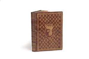 [RELIURE du XVIIe siècle]. Petit in-4, maroquin rouge, dentelle droite en encadrement avec semé de fleurs de lys, armoiries, dos à 5 nerfs orné à l’identique, tranches dorées.