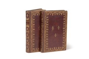 [RELIURE du XVIIIe siècle]. 2 volumes in-8, maroquin rouge, encadrement droit formé de filets, dents de rats et multiples fers spéciaux juxtaposés, au centre 3 lys dorés, dos lisses ornés, roulette intérieure, tranches dorées.