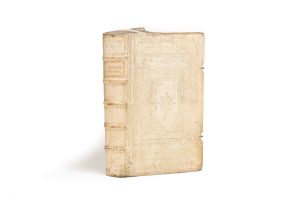 [RELIURE du XVIIIe siècle]. Petit in-folio, vélin crème sur ais, les plats entièrement ornés d’un décor à froid formé de multiples encadrements de filets et roulettes diverses avec fleurons spéciaux, au centre le chiffre du christ JHS...