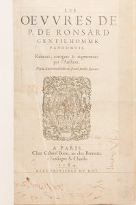 Pierre de RONSARD. Les Œuvres de P. de Ronsard gentilhomme vandomois. Paris, Buon, 1584. In-folio, vélin à petits recouvrements, dos lisse, tranches dorées (reliure moderne).