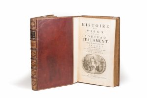[SAINTE BIBLE]. Histoire du Vieux et du Nouveau Testament. Amsterdam, Mortier, 1700. 2 volumes in-folio, maroquin rouge, triple filet, dos à 6 nerfs ornés, roulette intérieure, tranches dorées sur marbrure (reliure de l’époque).