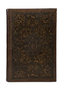 décor sur les plats et le dos lisse composé de multiples filets s’entrecroisant, les champs emplis de petits fers et fleurons spéciaux, points, étoiles, fleurs, et armoiries centrales (reliure du XVIe siècle entièrement restaurée avec le dos refait).