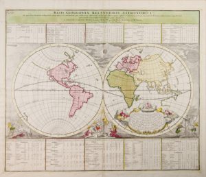 Incisione in rame con coloritura coeva in rosso, verde e giallo. mm 495x595. Foglio: mm 545x620. Titolo in alto al centro. Mappa del mondo divisa in due emisferi pubblicata dall'Homann a Norimberga e con il rilievo del Doppelmayr, autore del famoso Atlante Celeste. Ornata di allegorie dell'astronomia e della Geografia e con tavole per il rilievo della latitudine e della longitudine nelle varie città del mondo. Bel mappamondo con solo lievi tracce di foxing, e con gli angoli incollati ad un cartone di supporto.