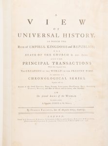 Francis TALLENTS. A view of universal history. Londres, Bonwicke…, 1758. In-folio, demi-veau marron à petits coins de vélin, dos à 6 nerfs orné (reliure pastiche).