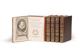 Jacques-Auguste de THOU. Histoire universelle depuis 1543 jusqu’en 1607. Londres (Paris), 1734. 16 volumes in-4, veau brun, mention St. Vigor sur le premier plat et de Bayeux sur le second, dos à 5 nerfs ornés (reliure de l’époque).